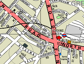 Take the subway to Leicester Square Station and there change to the NORTHERN LINE. Then take a train direction EDGWARE to Golders Green Station.